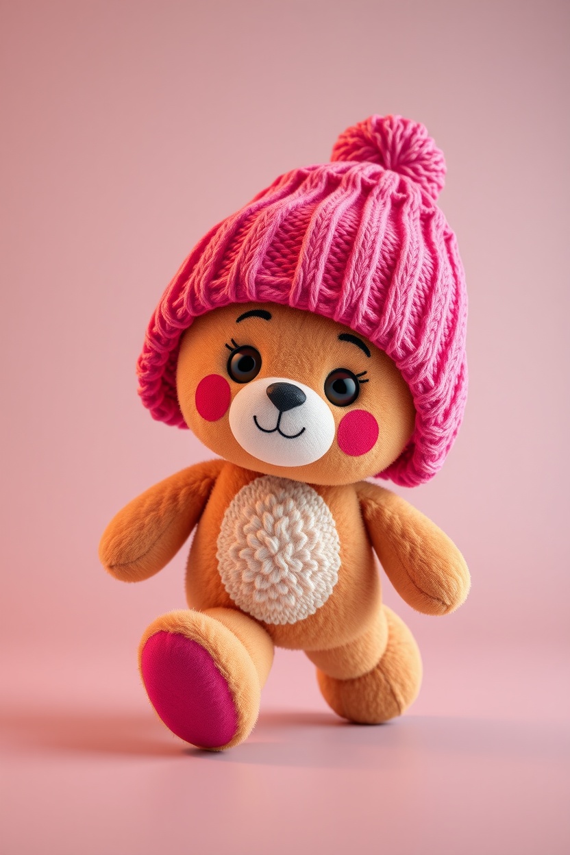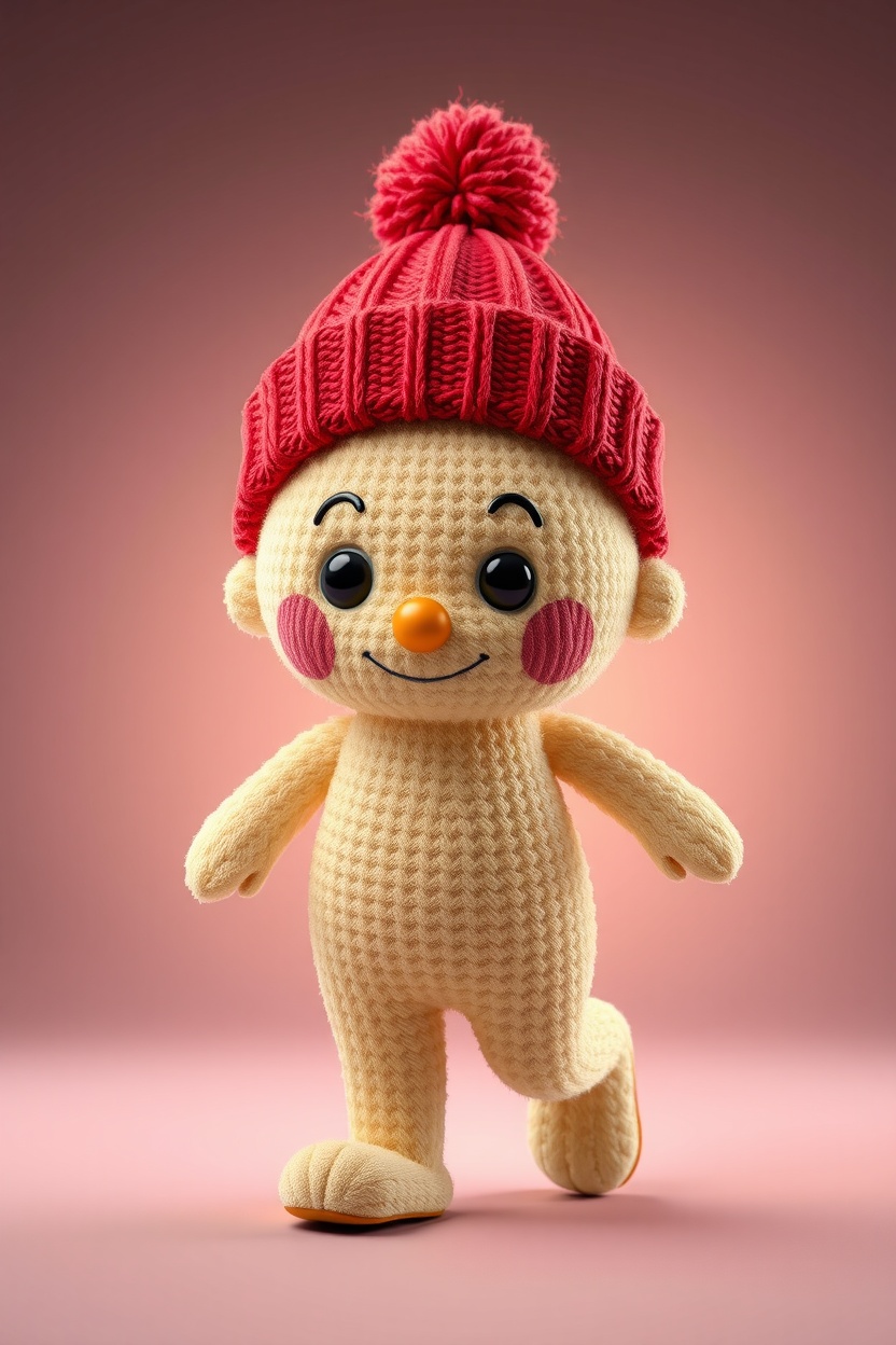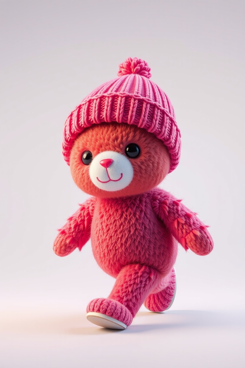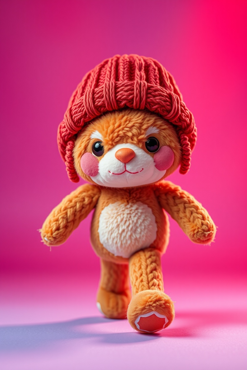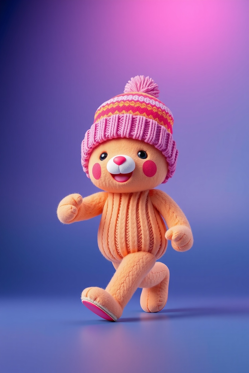 1 Вариант: Cute plush figure, in a knitted beanie hat, full-length, walking pose, soft plush texture, Colorful, playful, cinematic lighting, highly detailed, realistic fabric texture, 9:16 vertical, Instagram Reels style, isolated on a simple background