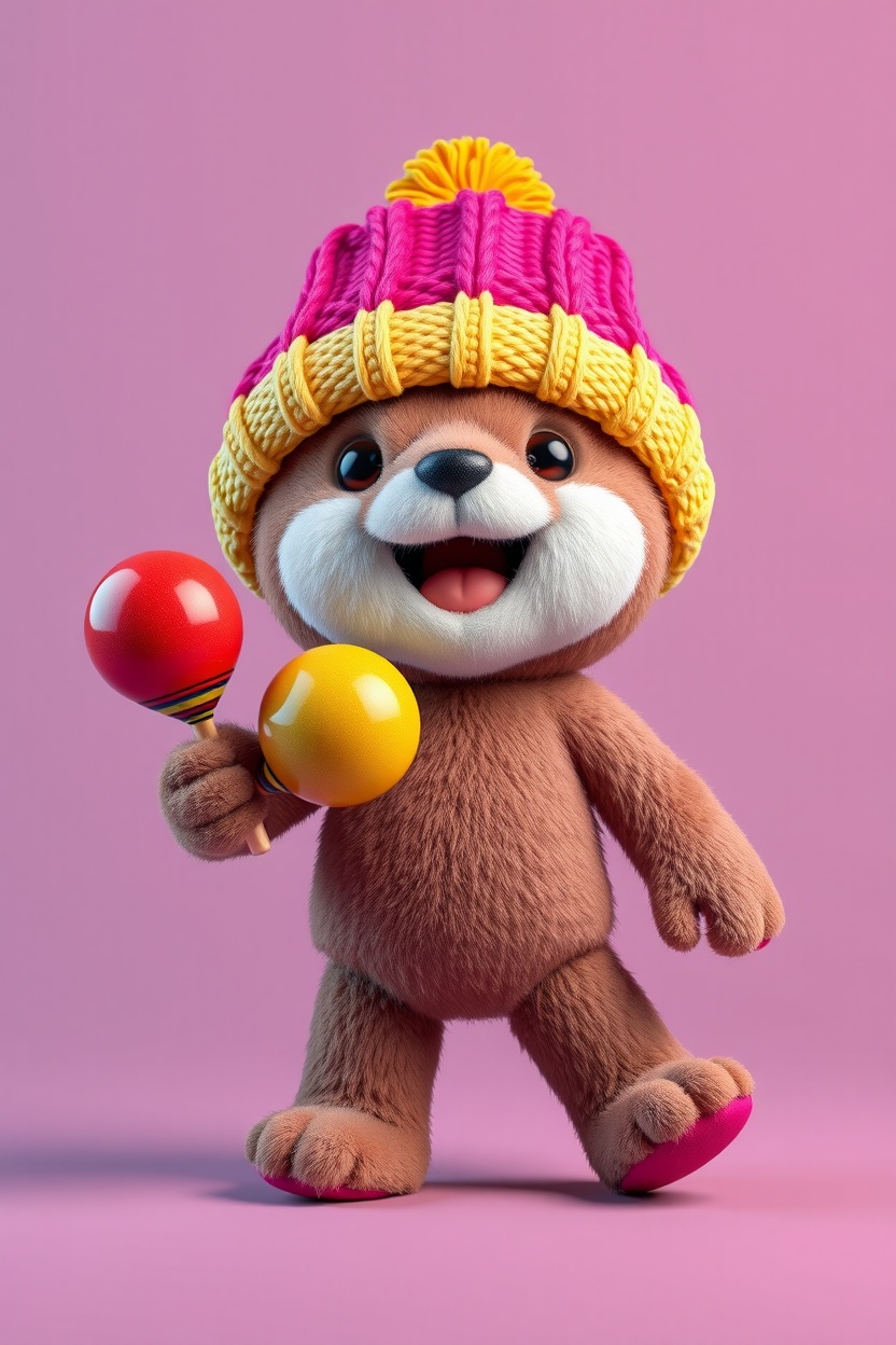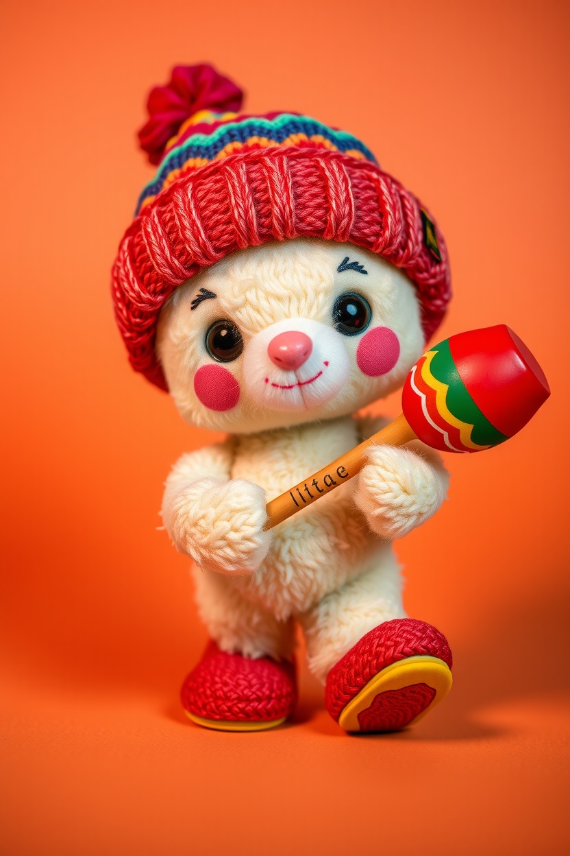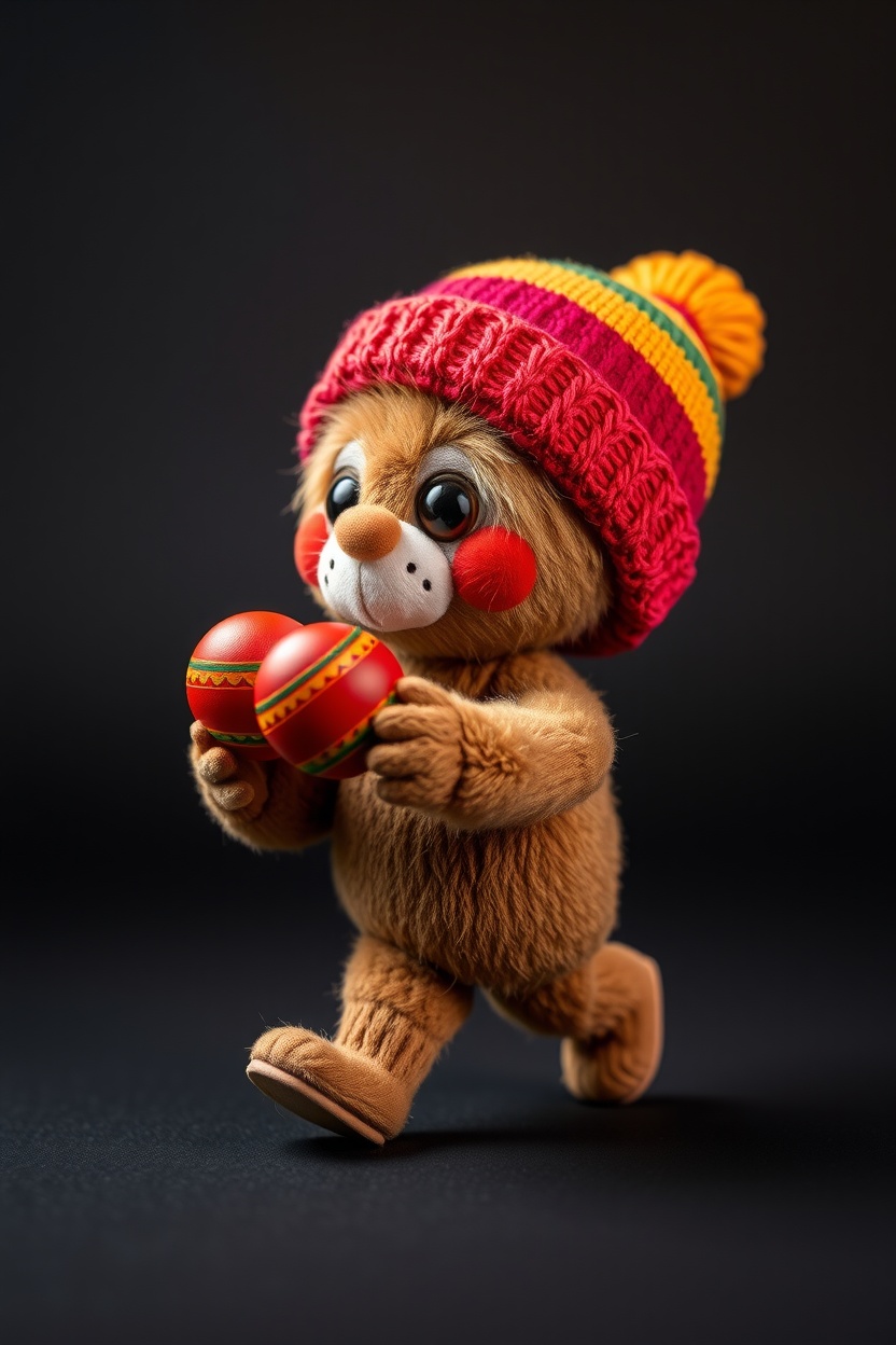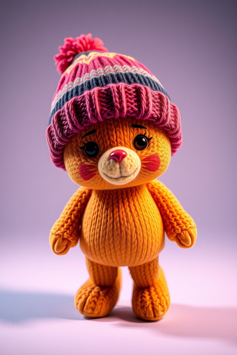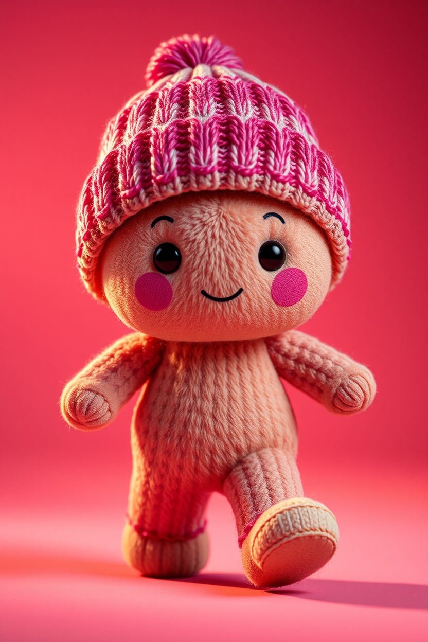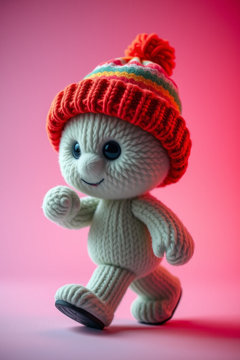 1 Вариант: Cute plush figure, in a knitted beanie hat, full-length, walking pose, soft plush texture, Colorful, playful, cinematic lighting, highly detailed, realistic fabric texture, 9:16 vertical, Instagram Reels style, isolated on a simple background