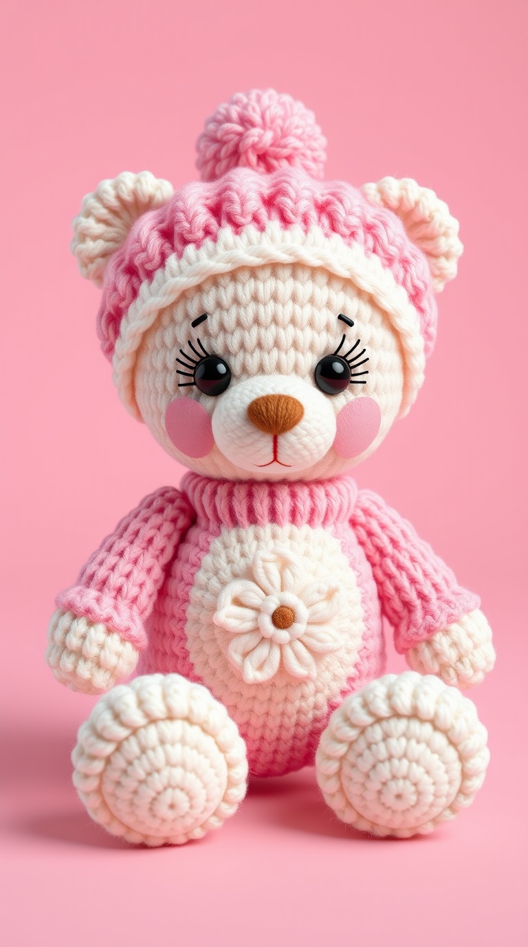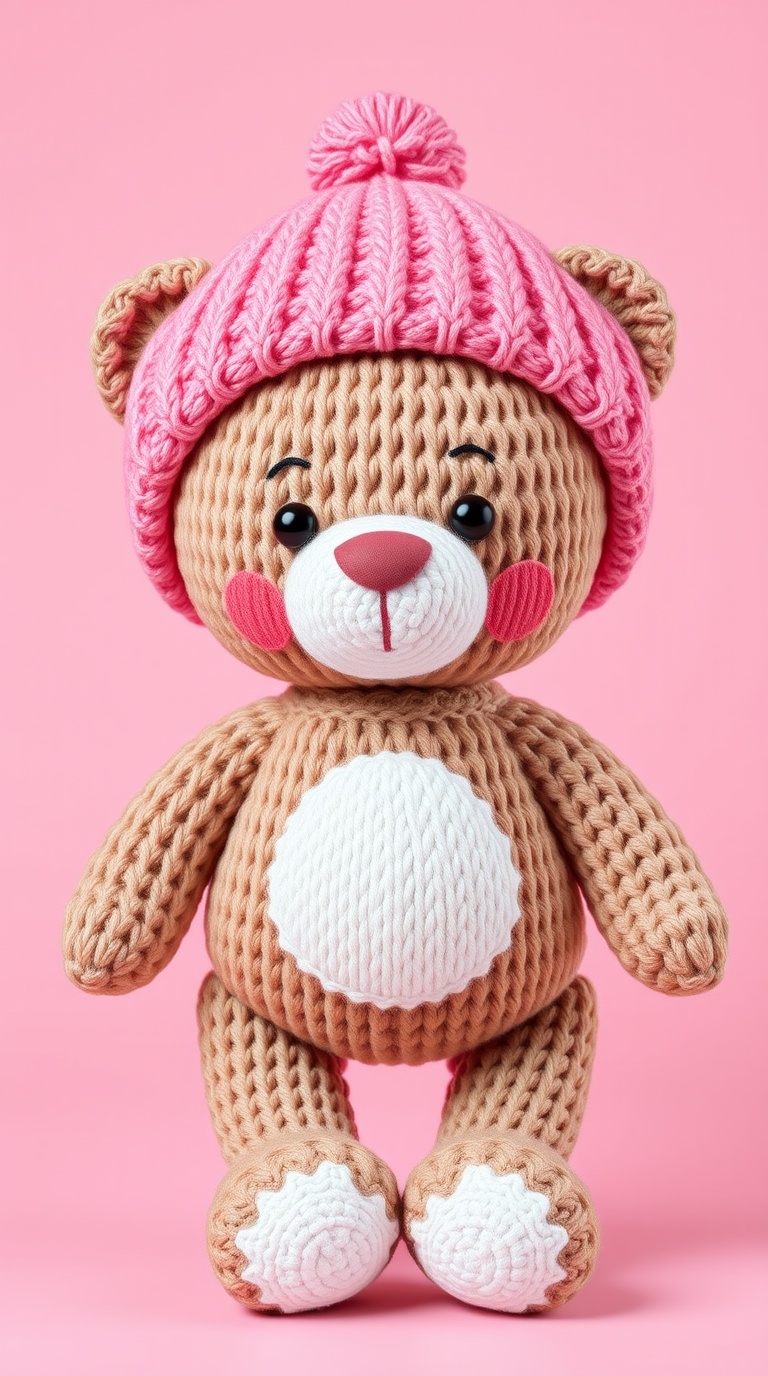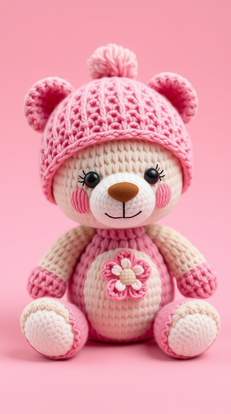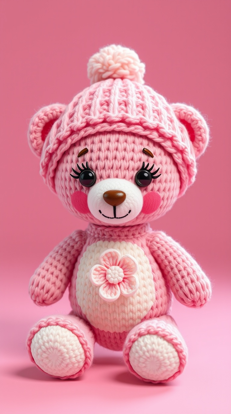 3 Вариант: «Cute knitted teddy bear amigurumi in pink and cream colors, wearing pink knitted hat with fluffy pompon, white belly with flower texture, rosy cheeks, black eyes with eyelashes, brown nose, white feet, soft pastel palette, cozy handmade toy, studio photography, pink background, 3d render style, adorable children’s gift, kawaii aesthetic»
