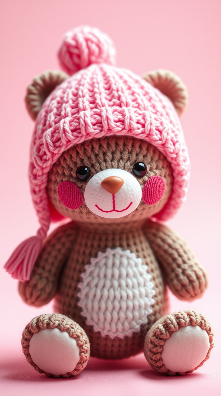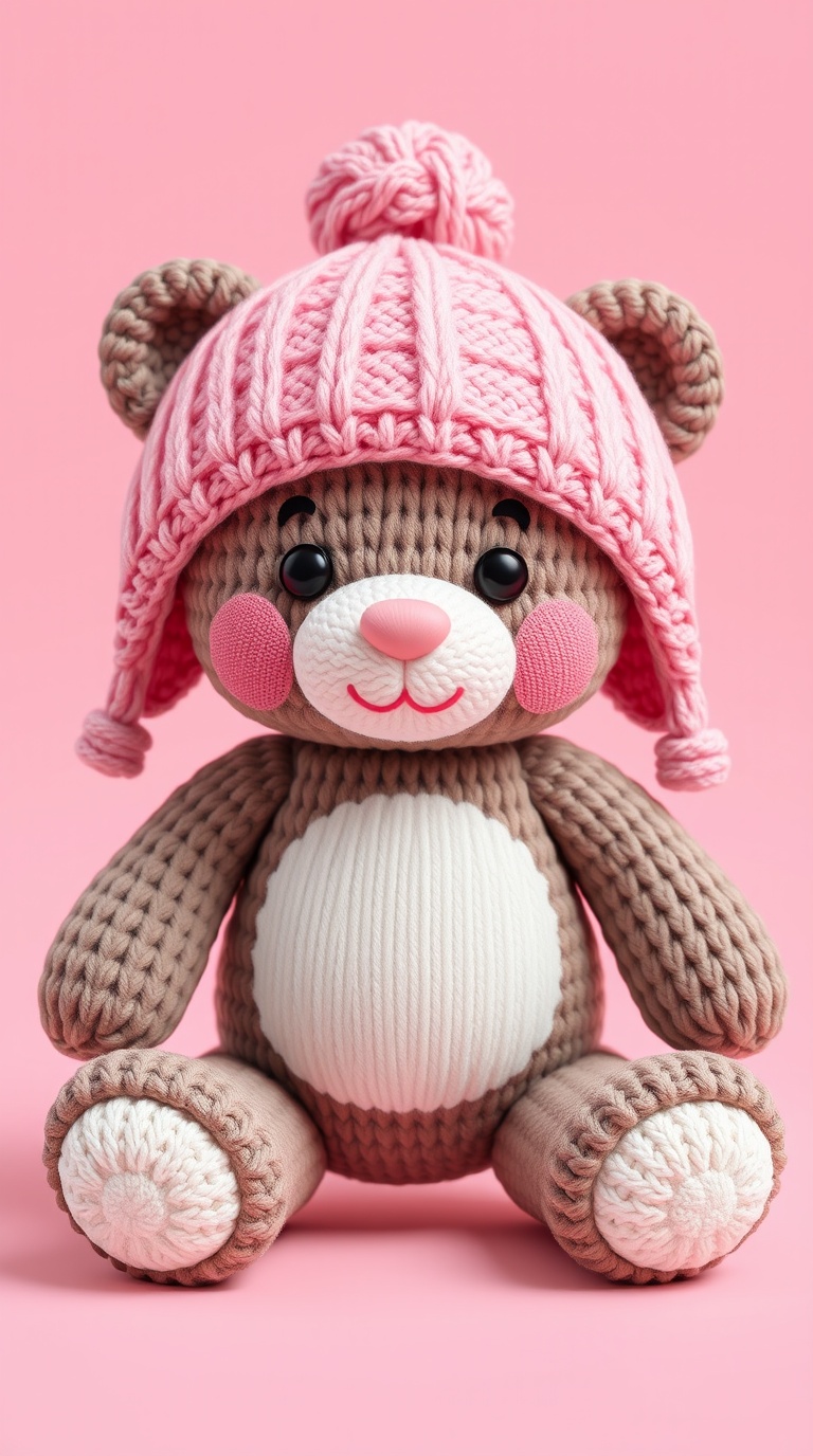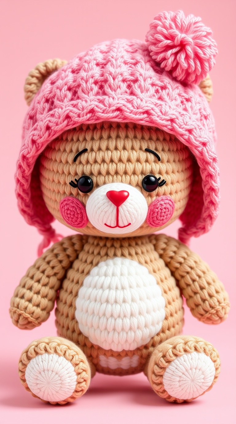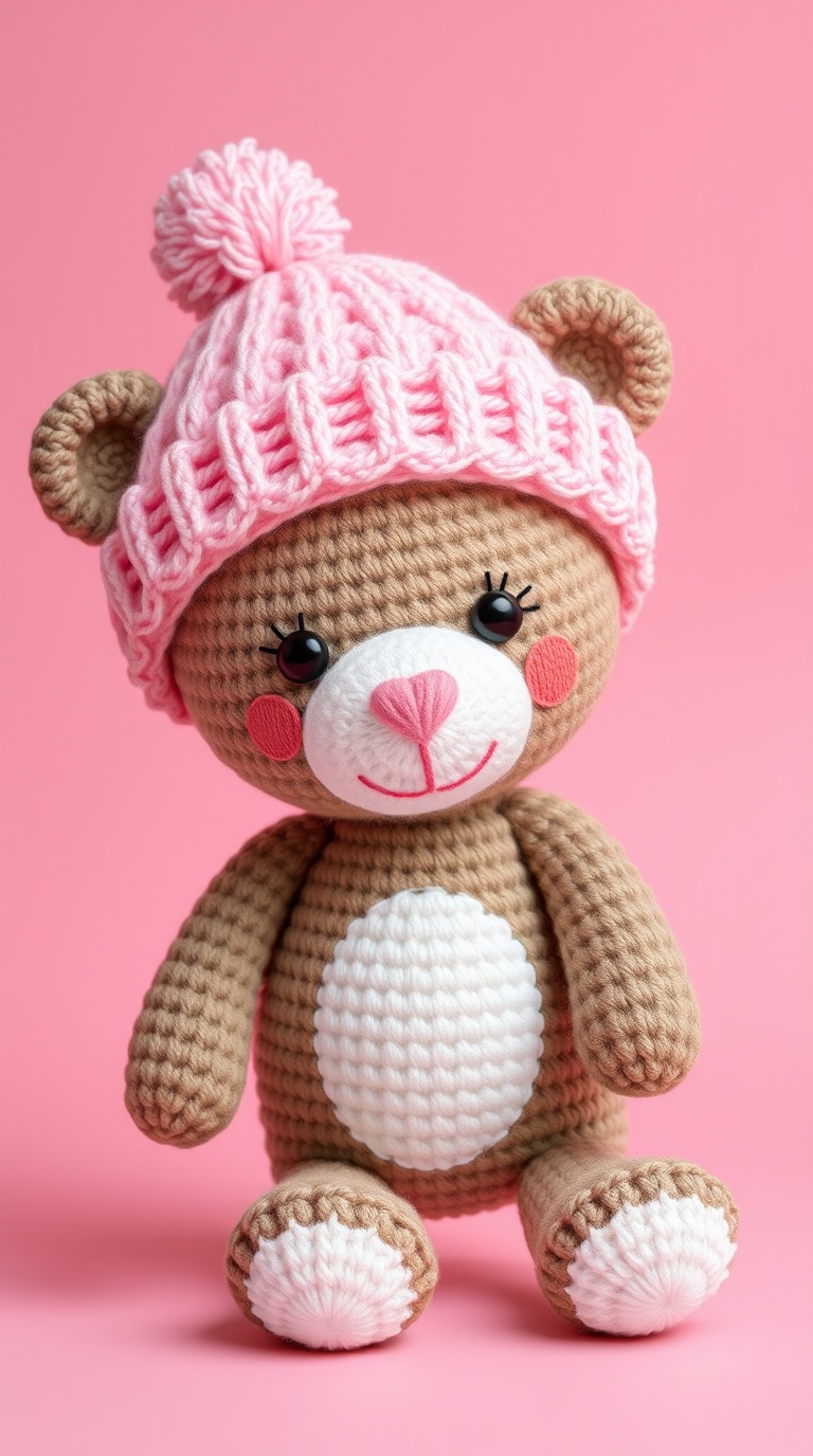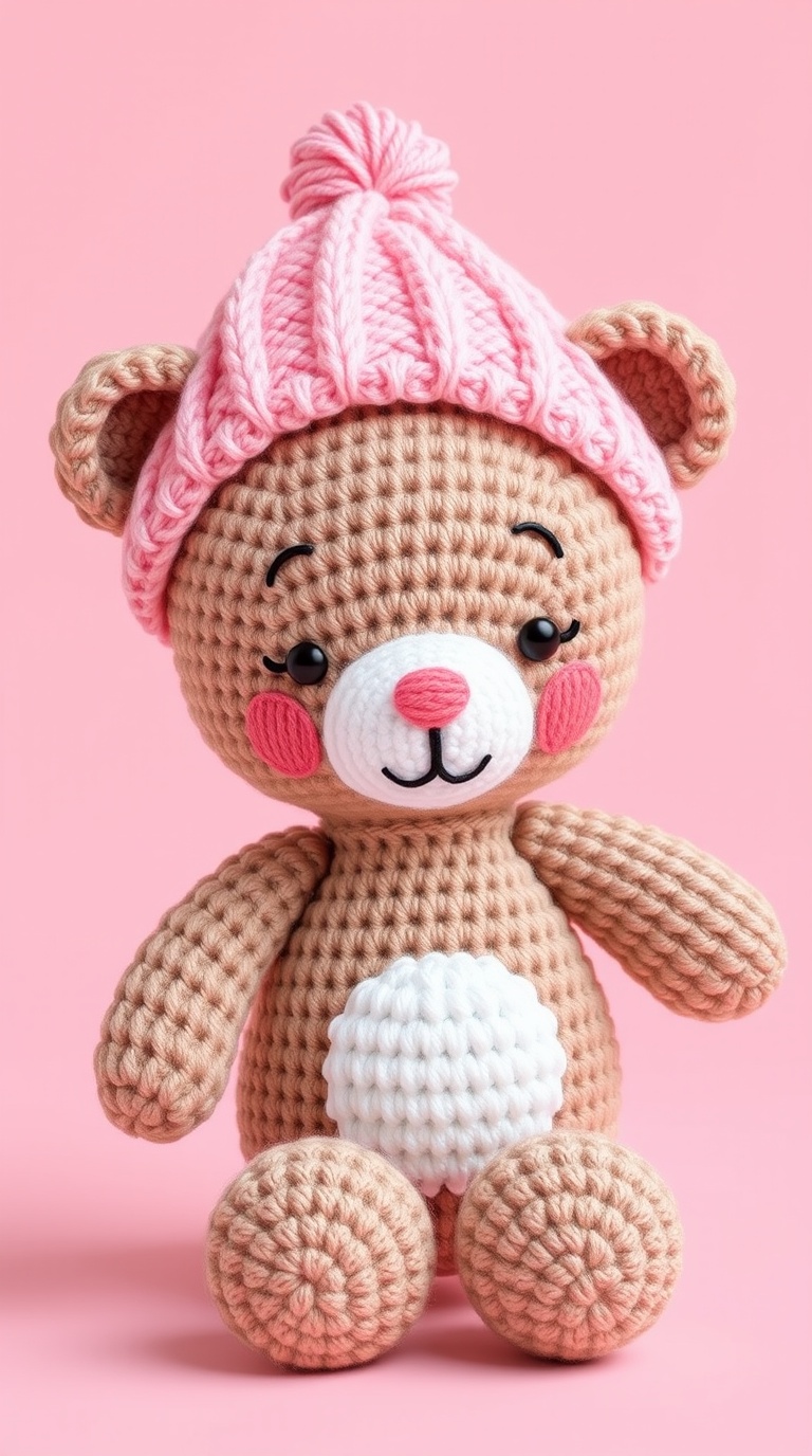 3 Вариант: «Cute knitted teddy bear amigurumi in pink and cream colors, wearing pink knitted hat with fluffy pompon, white belly with flower texture, rosy cheeks, black eyes with eyelashes, brown nose, white feet, soft pastel palette, cozy handmade toy, studio photography, pink background, 3d render style, adorable children’s gift, kawaii aesthetic»